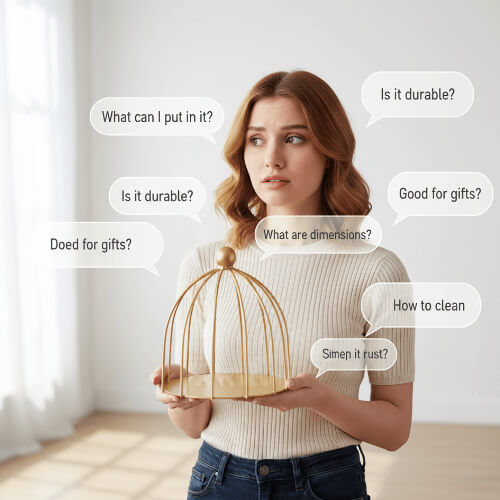Dress up birthdays with this elegant gold metal cage gift hamper basket for wife and girlfriend. The round plate base keeps goodies secure while the open cage makes everything look celebratory—perfect for turning chocolates, self-care minis, or candles into a polished birthday basket for her. Lightweight yet sturdy, it’s a reusable showpiece that looks great on a dresser or coffee table long after the party.
